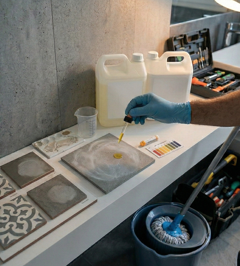 Lavaggio acido: Utilizzo di un detergente a base acida tamponata per sciogliere i residui di cemento e stucco.